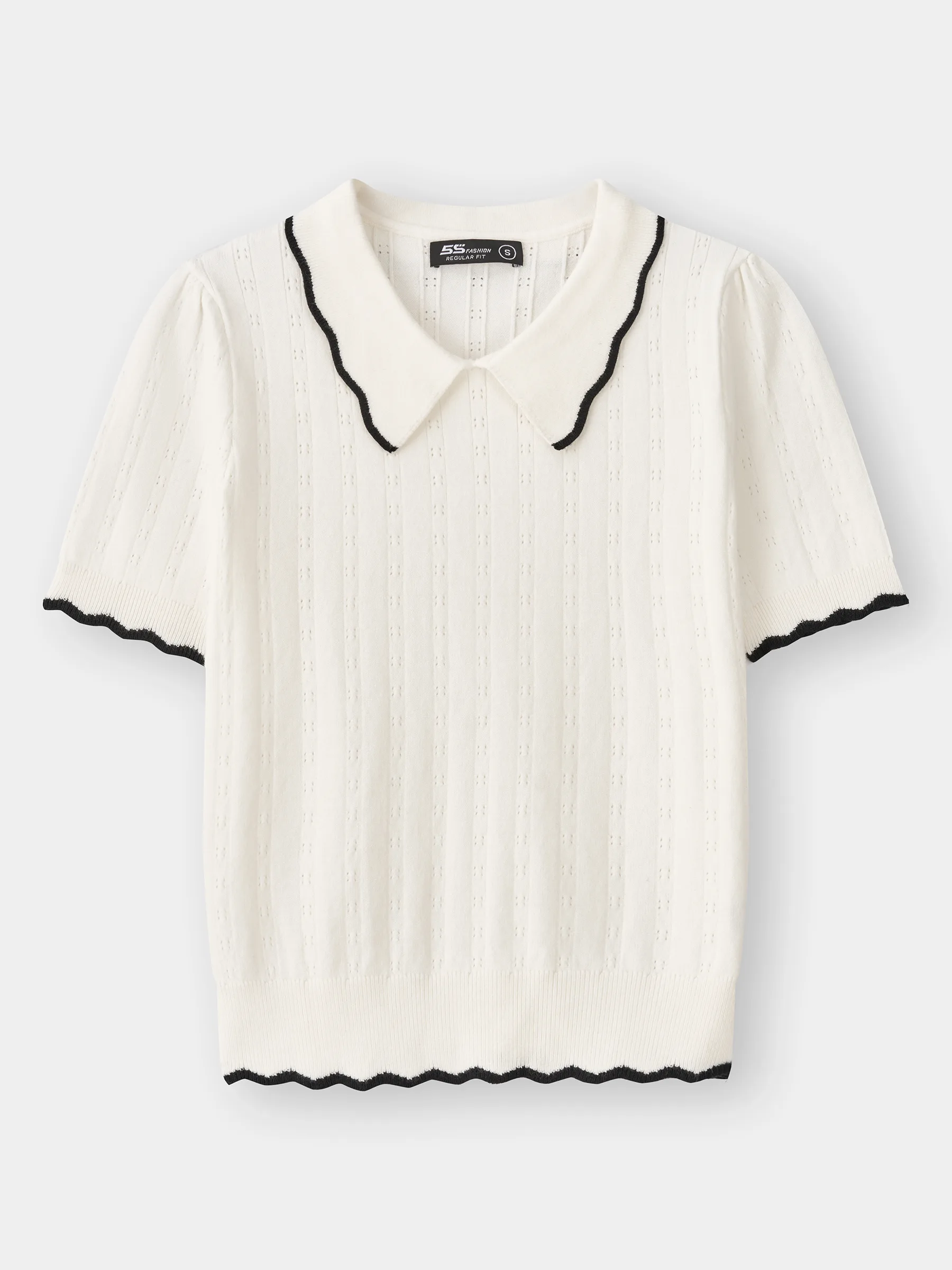 Mang đậm phong cách thanh lịch pha chút retro ngọt ngào, mẫu áo len tay ngắn cổ danton W0ALC25006 từ 5S FASHION là gợi ý lý tưởng cho những cô nàng yêu thích sự tinh giản mà vẫn cuốn hút. Phom dáng cơ bản kết hợp cùng phần viền lượn sóng màu đen nổi bật tại cổ, tay và gấu áo giúp tổng thể trở nên mềm mại và thu hút hơn trong từng chuyển động.