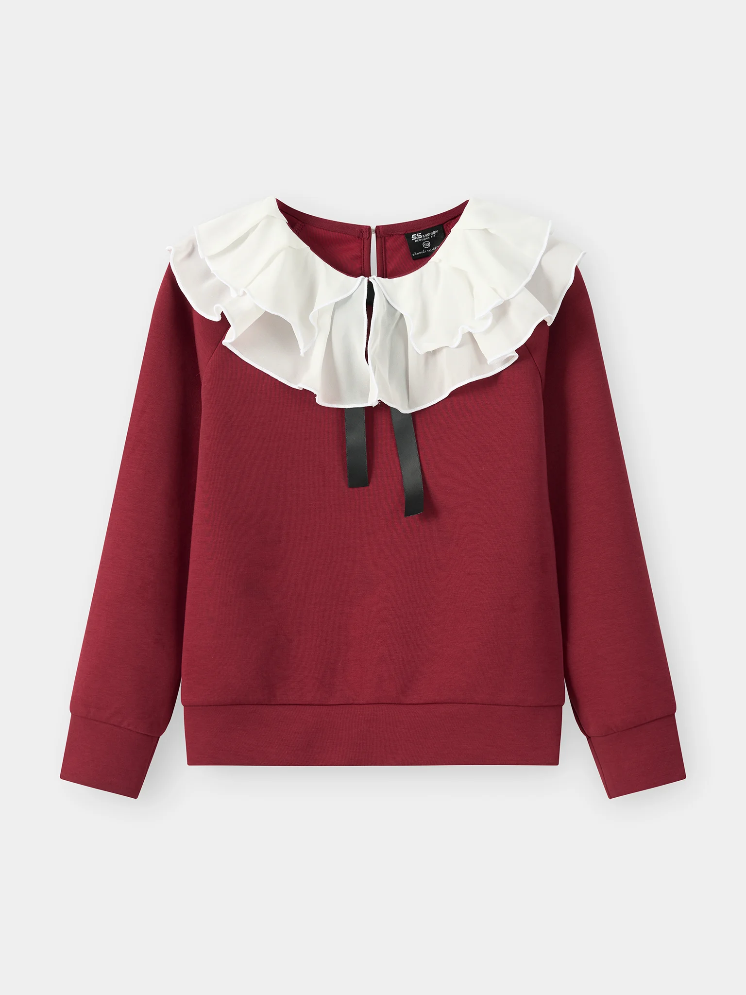 Thiết kế cổ bèo phối nơ: Phần cổ phối bèo tầng bồng bềnh kèm dây nơ đen – tạo điểm nhấn nữ tính, duyên dáng.