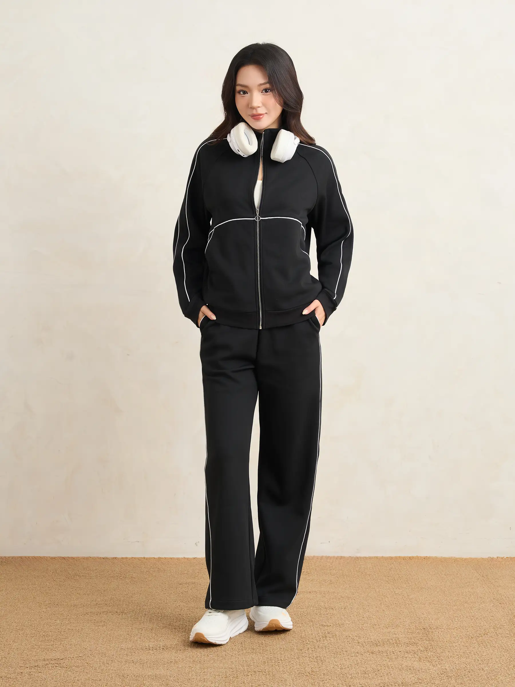 Đường viền phối màu trắng nổi đồng bộ ở áo và quần tạo điểm nhấn năng động, cá tính